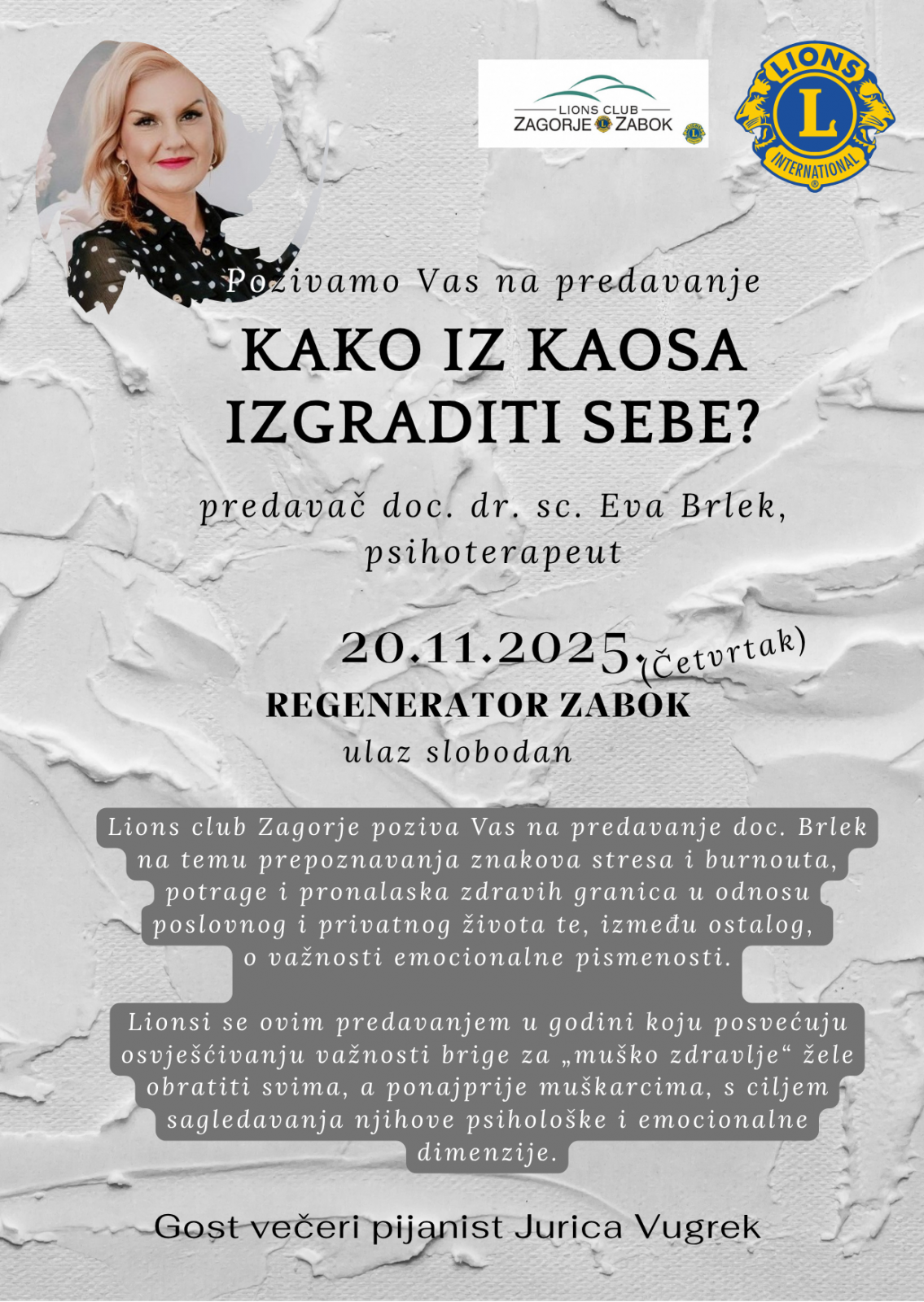 Lions klub Zagorje organizira predavanje na temu „Kako iz kaosa izgraditi sebe“ koje će u prostoru Regeneratora u Zaboku u četvrtak, 20. studenog u 19h održati psihoterapeutkinja doc. dr. sc. Eva Brlek (Nueva kabinet). Predavanjem se želimo obratiti svima koji traže ili žele očuvati unutarnji mir u neprekidnoj utrci sa svakodnevicom te u kaosu obaveza ne žele ipak zaboraviti i na same sebe kao osobu.