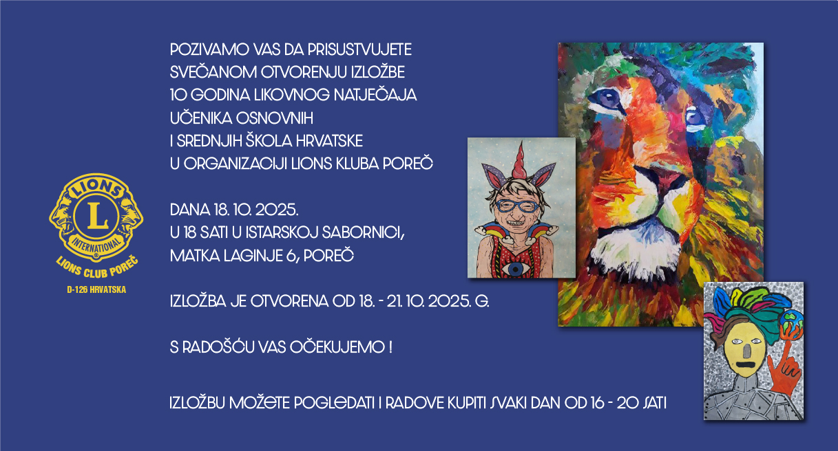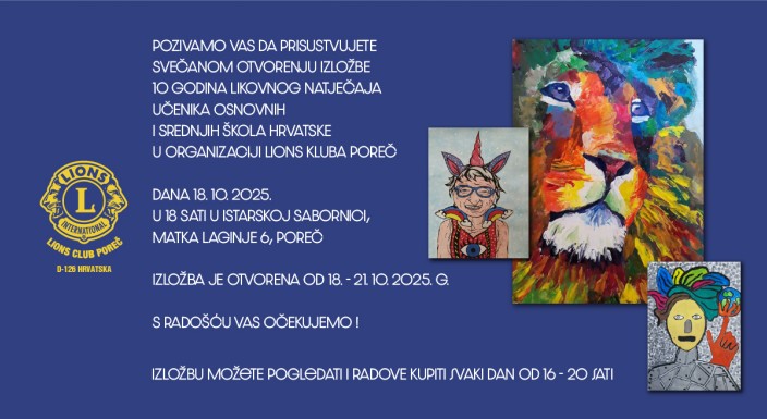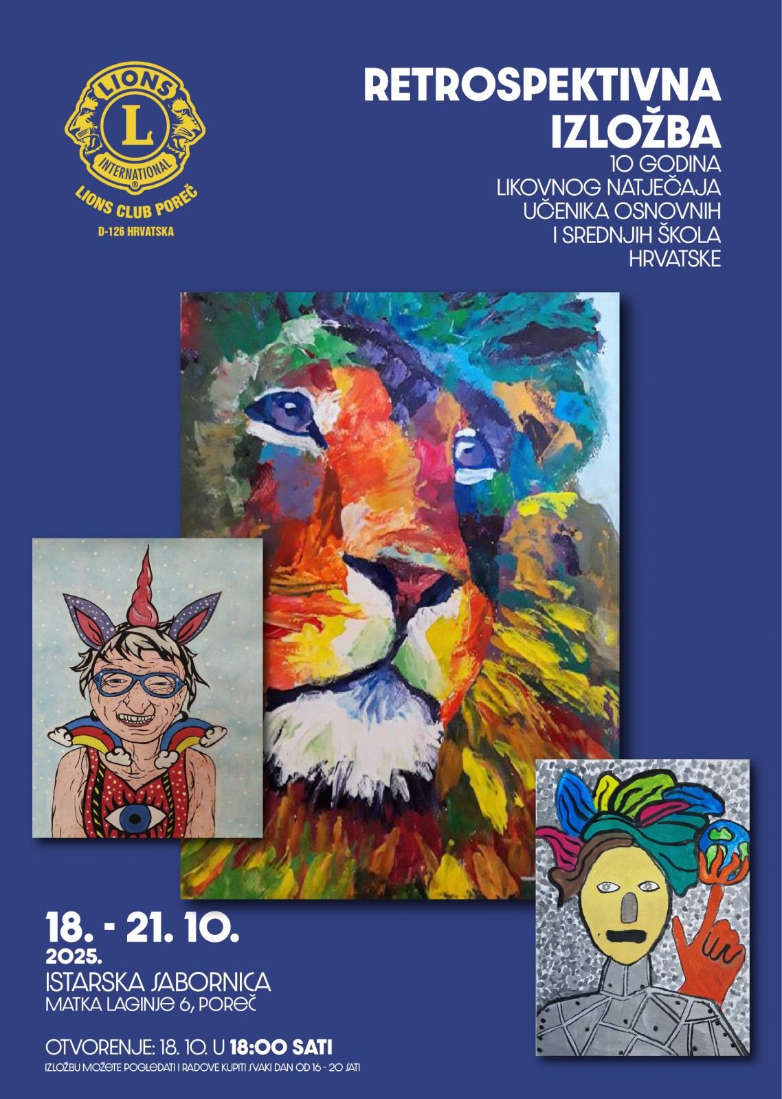 Klub: Poreč - LC PorečOrganizator: KlubTip događaja: Club EventDatum događaja: subota, 18 listopada, 2025 - 18:00 do utorak, 21 listopada, 2025 - 20:00 za 9 danaAdresa: Sabornica PorečPorečHrvatskaPrilozi: retrospektivna_izlozba.jpg pozivnica.jpg