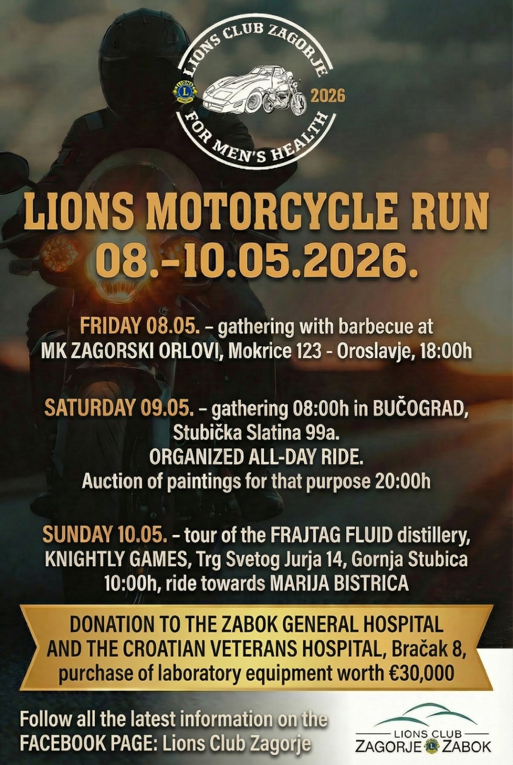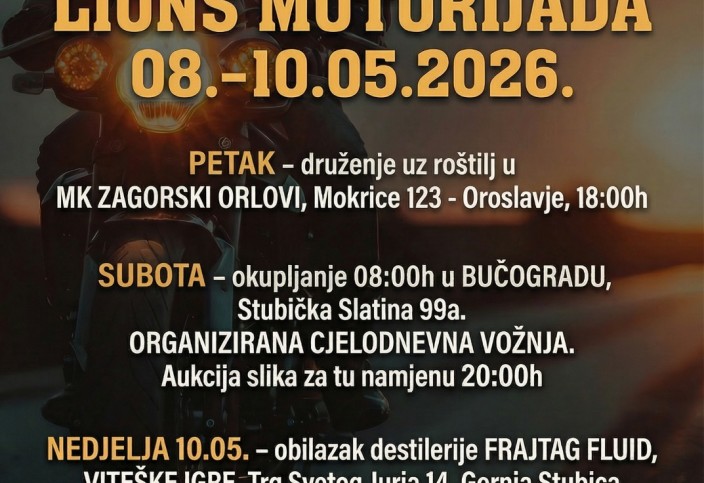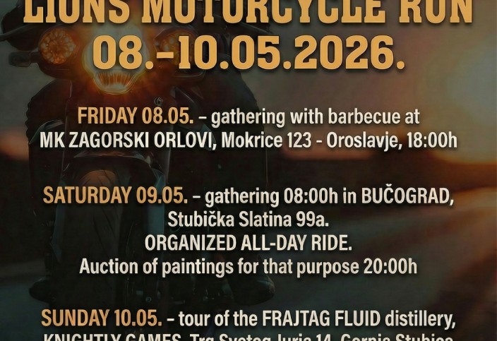 Pozivamo sve Lionse i prijatelje Lionsa na humanitarnu akciju motorijadu koju pod motom "Zajedno za muško zdravlje" organiziramo od 8. do 10. svibnja 2026., a s ciljem prikupljanja sredstava za nabavu novog uređaja za potrebe Opće bolnice Zabok i bolnice hrvatskih veterana (laboratorijskog uređaja kriostata) čija vrijednost iznosi 30.000,00 Eura.