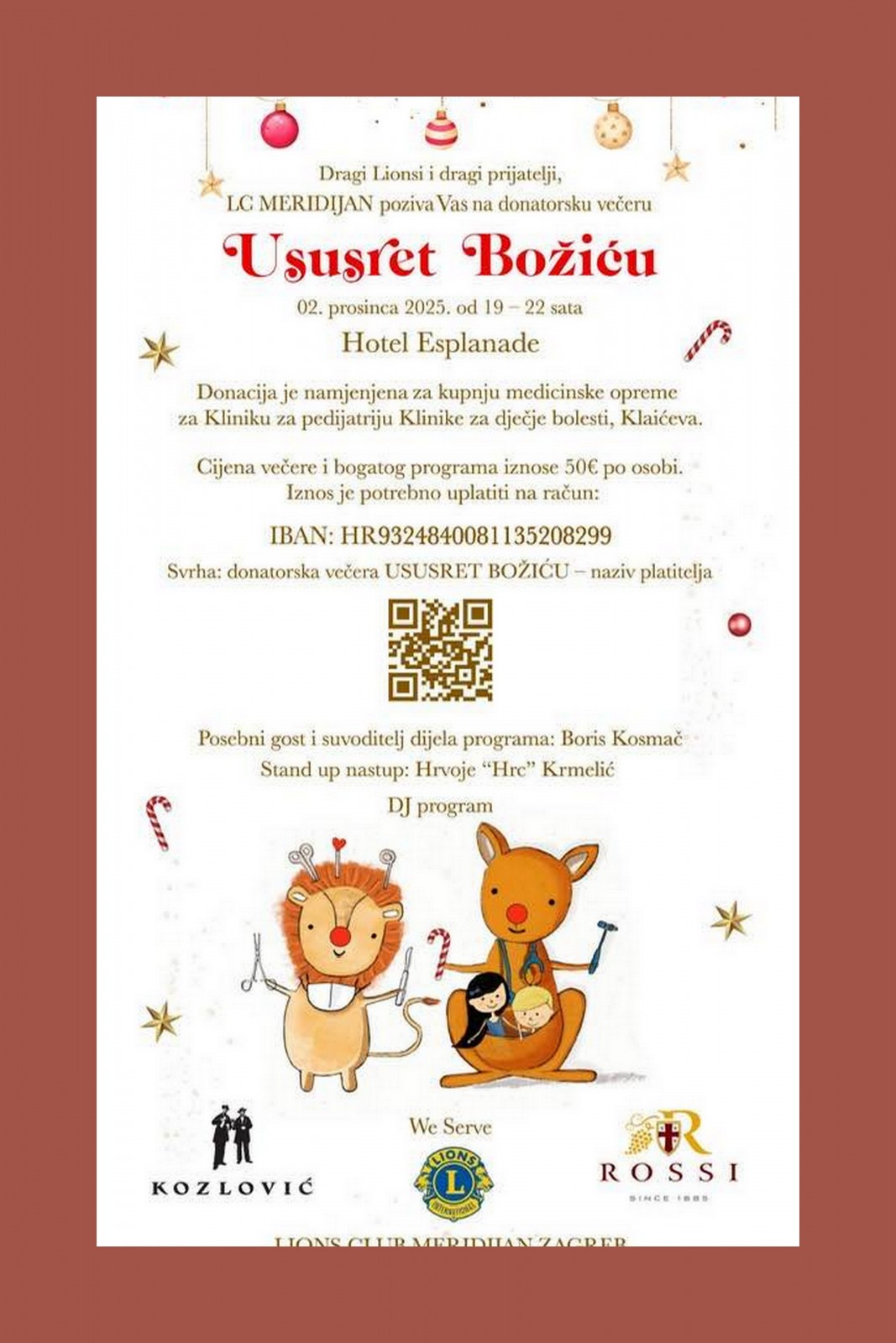 LC Meridijan s veseljem Vas poziva na donatorsku večer „Ususret Božiću“ na kojoj će se prikupljati sredstva za nabavu medicinske opreme za Kliniku za pedijatriju Klinike za dječje bolesti Zagreb, Klaićeva.