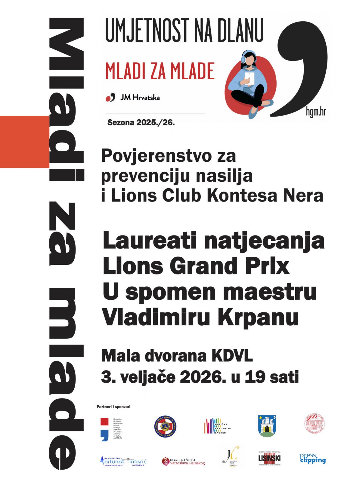 Koncertom predstavljamo mlade laureate Lions Grand Prix-a u suradnji Povjerenstva za prevenciju nasilja , LC Kontesa Nera i Hrvatske glazbene mladeži. Ove godine je koncert namijenjen uspomeni maestru VLADIMIRU KRPANU, glazbeniku i plemenitom čovjeku.