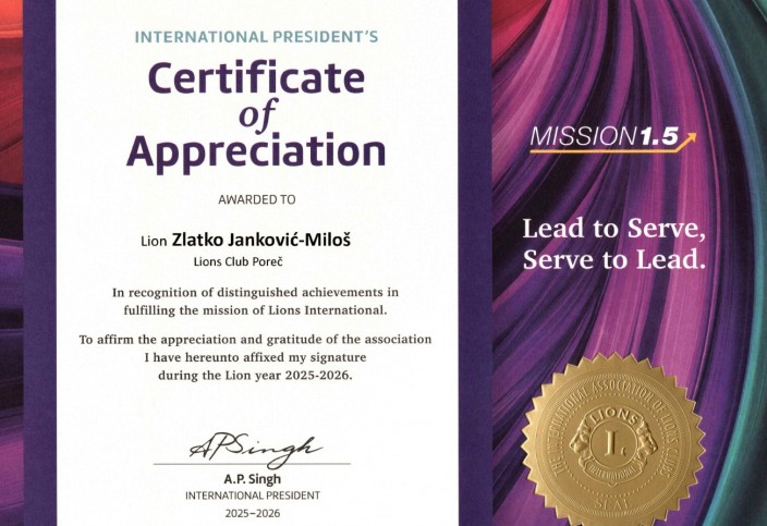 U sklopu svečanosti bratimljenja LC Lenuci i LC Poreč koja je održana u sklopu 3.Sjednice kabineta Marinele Rosso u Zagrebu ID Dražen Melčić je dodijelio priznanja Internacionalnog Predsjednika A.P. Singh iz Indije Sanji Kalmbura predsjednici LC Lenuci, Vesni Boinović – Grubić KOO za Leo distrikt, Đeku Šuriji predsjedniku LC Poreč i Zlatku Janković Miloš tajniku kabineta D-126 u znak priznanja za izvanredna postignuća u ispunjavanju misije Lions Internationala A.P. Singh MEĐUNARODNI PREDSJEDNIK LG 2025.-2026.